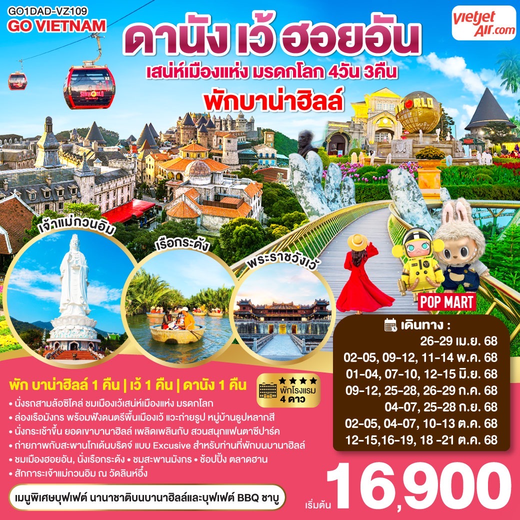 เที่ยวเวียดนาม พักโรงแรมบนบาน่าฮิลล์ 1 คืน 4 ดาว / ดานัง 2 คืน 4 ดาว ล่องเรือกระด้ง – เมืองโบราณฮอยอัน – สะพานญี่ปุ่น – วัดกวางตุ้ง – บ้านโบราณ – วัดนามเซิน – APEC PARK – สวนมหัศจรรย์ GOLDEN BAY – MY KHE BEACH - วัดหลินอึ๋ง – MARINA CAFÉ – ขึ้นกระเช้าบาน่าฮิลล์ – สวยดอกไม้ฝรั่งเศส – สะพานมือสีทอง – POPMART – จัตุรัสแห่งดวงดาว – ECLIPSE SQUARE - สวนสนุกแฟนตาซี พาร์ค – อิสระทุกท่านเพลิดเพลินกับบาน่าฮิลล์ – ตลาดฮาน – สะพานมังกร – สะพานแห่งความรัก