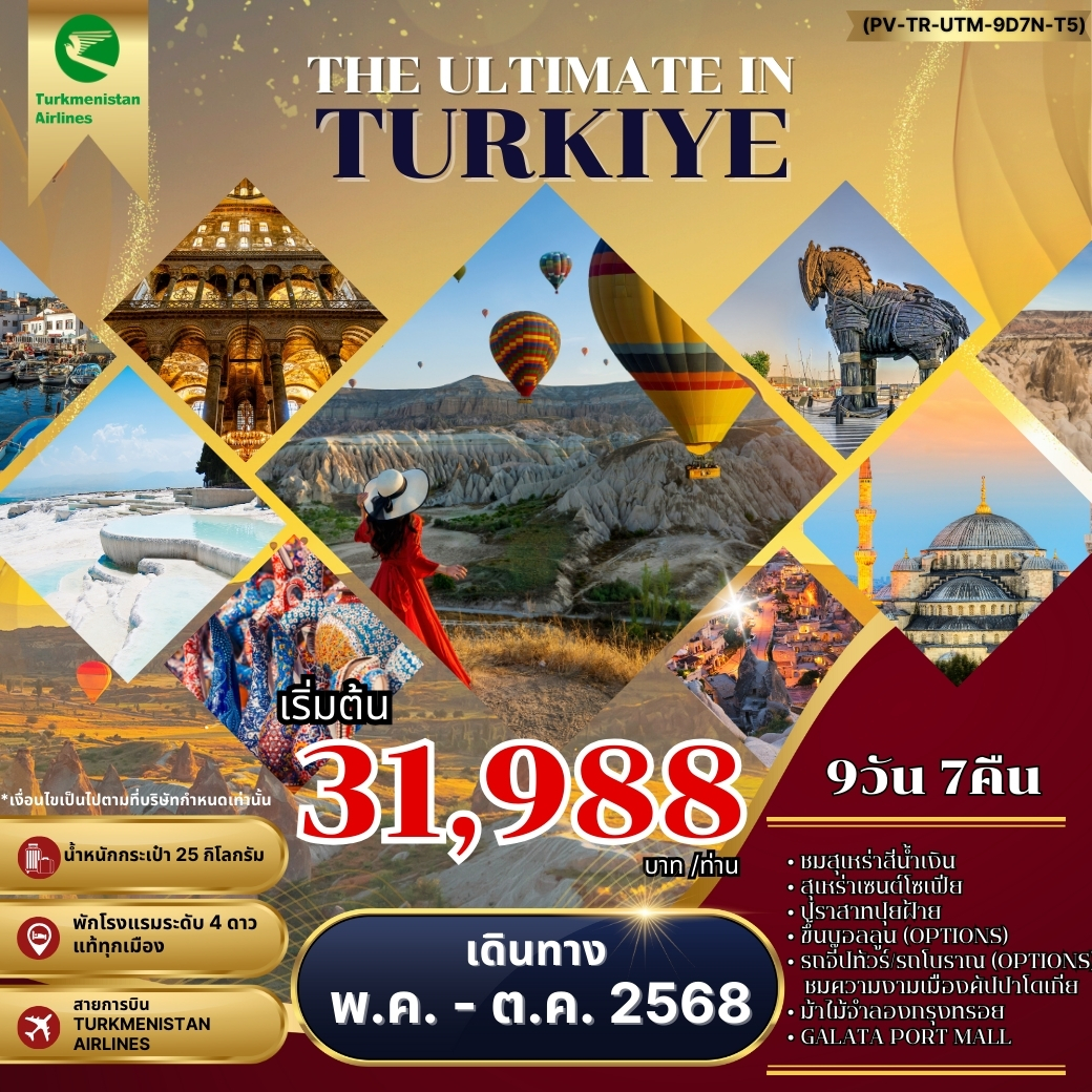 ครั้งหนึ่งในชีวิต Must Go! อย่าเสียเที่ยว... ต้องไปชมม้าไม้ เมืองทรอย พักโรงแรม 4-5 ดาว 7 คืน (พิเศษพัก...คัปปาโดเกีย 2 คืน) บินสู่ตุรเคีย เครื่องลำใหญ่ โดยสายการบิน Turkmenistan Airlines ชม สุเหร่าสีน้ำเงิน-ฮิปโปโดรม-สุเหร่าเซนต์โซเฟีย ชมดินแดนแห่งเทพนิยาย คัปปาโดเกีย (ซื้อทัวร์ ขึ้นบอลลูนชมวิว) ชมดินแดนอันน่าอัศจรรย์ ปามุคคาเล่ (ปราสาทปุยฝ้าย) ชม สุสานอตาเติร์ก สุสานที่เก็บร่างของผู้นำที่เปลี่ยนแปลงชาติตุรกี ชม โรงงานเครื่องหนัง ซึ่งมีชื่อเสียงโด่งดังของ ประเทศตุรกี ทะเลสาบโกลจุก (Golcuk Lake) ทะเลสาบน้ำจืด ที่สวยงดงาม ซาฟรานโบลู (Safranbolu) เมืองมรดกโลกทางด้านวัฒนธรรม ชมสัญลักษณ์อันชาญฉลาดด้านกลศึกของนักรบโบราณ ม้าไม้จำลองแห่งเมืองทรอย ช้อปปิ้งสินค้าพื้นเมืองคุณภาพที่ ตลาดสไปซ์ และย่าน TAKSIM SQUARE นำชม Galata Tower หอคอยแห่งพระคริสต์ และช้อปปิ้งแหล่งใหม่ Galataport Shopping พิเศษ...สุดๆๆ จุดเช็คอินแห่งใหม่ Seven Hills Café ชมความงามวิวร้อยล้าน ให้อาหารนกนางนวล